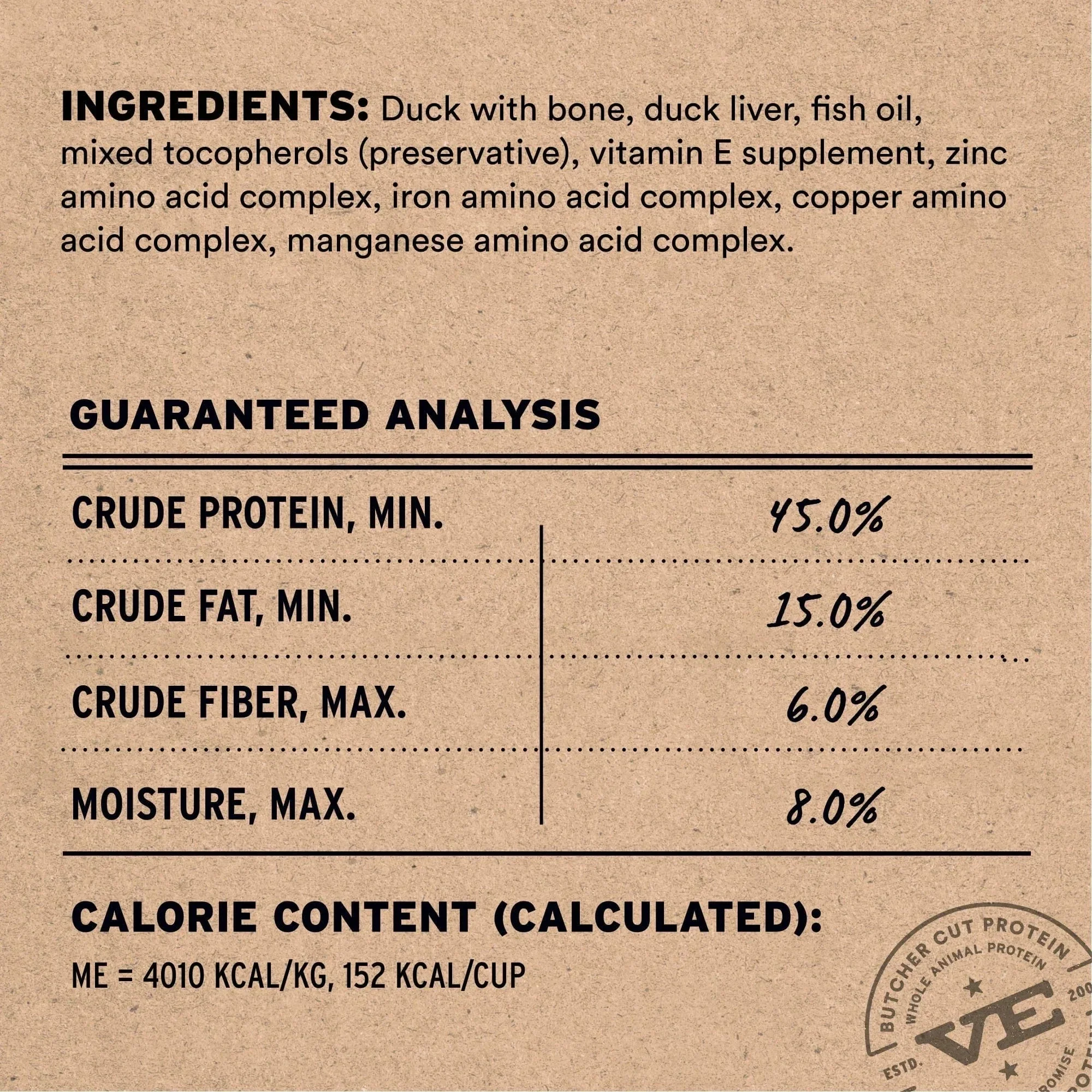 Duck with bone, duck liver, fish oil, mixed tocopherols (preservative), vitamin E supplement, zinc amino acid complex, iron amino acid complex, copper amino acid complex, manganese amino acid complex